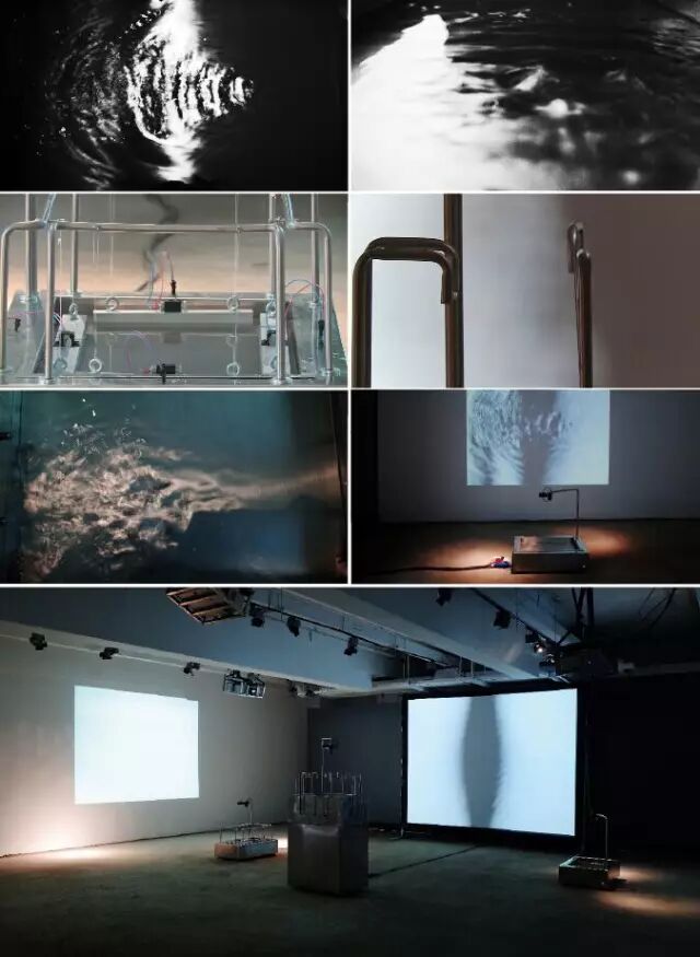 对于水的好奇可以追溯到童年时代,所以在大量的研究与尝试之后,我选择了水作为创作的媒介。水对周围的环境极其敏感,环境变化带来的波动会对平静的水面产生作用。我在《水波》系列中试图研究媒介与媒介之间的信息流通和转换,利用机械的震动,使空气、风与媒介(水)相互作用,表达一些偶然的、具有实验性的画面语言。我在这件作品中尝试用媒介属性相互转换的方式,重新看待诗与机械语言的关系。流畅灵动的画面语言与程序控制下节奏明确的机械运用相结合,使得诗与机械语言的结合叙述产生令人印象深刻的律动。