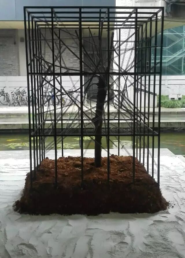 铁笼的柱子上缠着许多弹簧,而弹簧与树的枝干紧密连接。弹簧虽然拉扯着树的枝干,却又没有伤害的危险,关系微妙。看似是树在操纵弹簧,又似弹簧在支配着树,但外层还有铁笼束缚着树与弹簧···