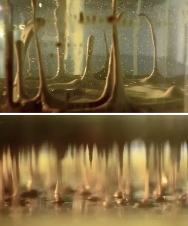 偶然的美往往是出乎意料的,而我这个系列的作品正是源于不同个“偶发”的组合。我将滤沙原理与游戏 Feed me oil 中石油在水中不断向上的状态结合,用机械的外力引导完成这一过程。机械外力与水、油抗力的对抗,油浮力与筛网的对抗···不同的力在同一空间里的矛盾冲突,激化了油产生不同的状态。而油的特殊性质与形态,也给了装置不同空间的扩展,并陷入打散、穿梭、拉伸、断裂、挣脱与融合的无限循环。